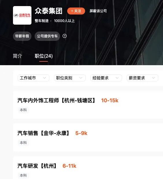 记者查询猎聘网招聘信息发现,目前•●,众泰集团正在招聘的岗位有24个,招聘岗位涵盖整车研发、整车热管理工程师、电控开发工程师■、电机研发工程师、电池工程师、车联网工程师以及汽车销售、法务■、审计、成本、采购、证券事务专员等岗位,工作地分布在金华和杭州两地。