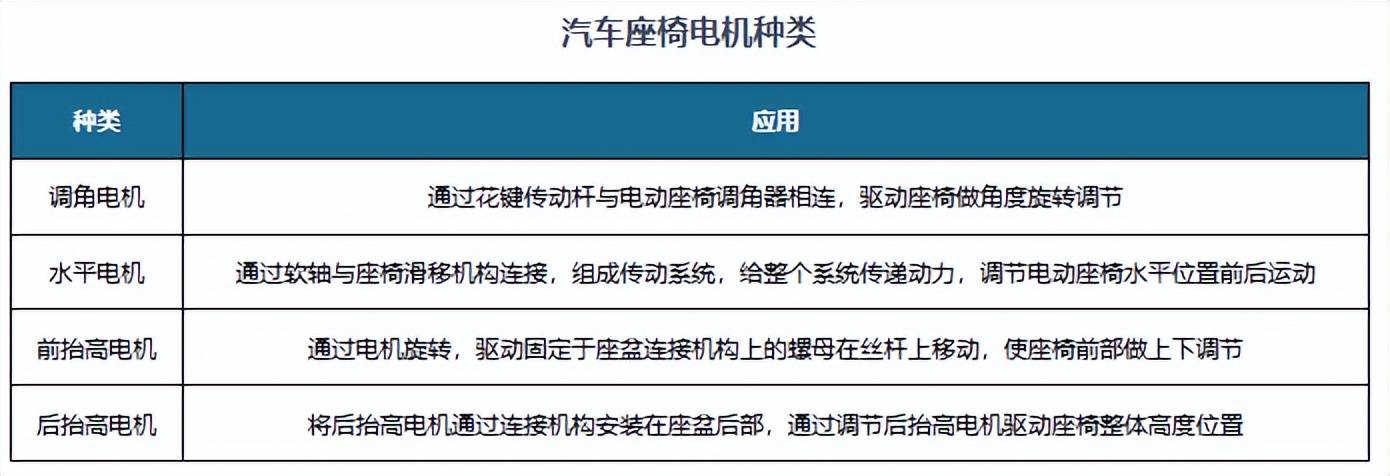 汽车座椅电机是实现座椅电动控制、为调节座椅提供动力的装置,按调节功能可分为四类。目前汽车座椅位置的调节分为手动机械调节和电动控制两种方式。座椅电机是实现汽车座椅电动控制,为调节座椅提供动力的装置,主要由电枢组件、机壳、端盖和减速箱组成,具有体积小、质量轻、高效、运行平稳、噪音低的特点。根据所实现的调节功能的不同,座椅电机主要可以分为水平调节电机、调角电机、前抬高电机、后抬高电机四类。