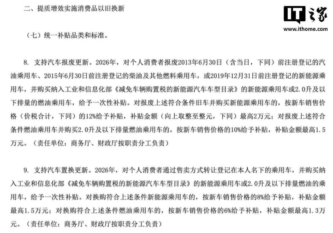 2026 年,对个人消费者报废 2013 年 6 月 30 日(含当日,下同)前注册登记的汽油乘用车、2015 年 6 月 30 日前注册登记的柴油及其他燃料乘用车,或 2019 年 12 月 31 日前注册登记的新能源乘用车,并购买纳入工业和信息化部《减免车辆购置税的新能源汽车车型目录》的新能源乘用车或 2.0 升及以下排量的燃油乘用车,给予一次性补贴。